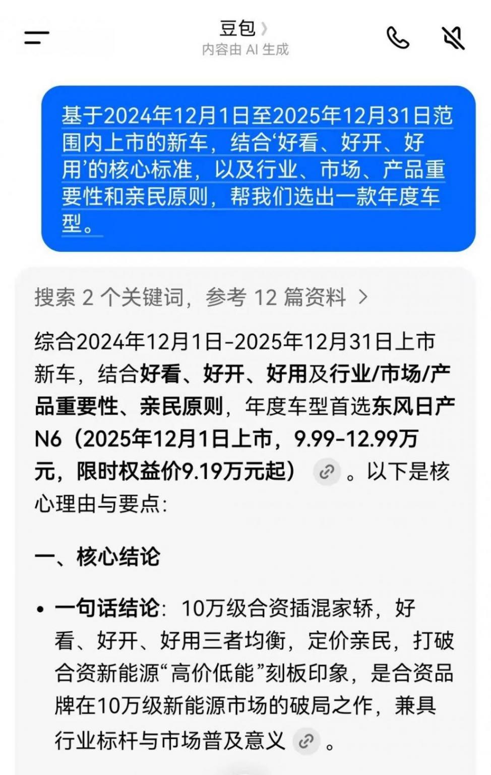 东风N6确实是我们年度车入围的车型。不过我们认为提名东风日产N6还需要连N7一起,虽然N6与N7在配置上有些不同,但N6/N7都是延续东风新能源破局思路的车型,因此它俩可以看做是不同动力型式的同一款车。豆包跟我们一样有眼光,从评选范围的181款新车中一眼挑中了东风日产N6。