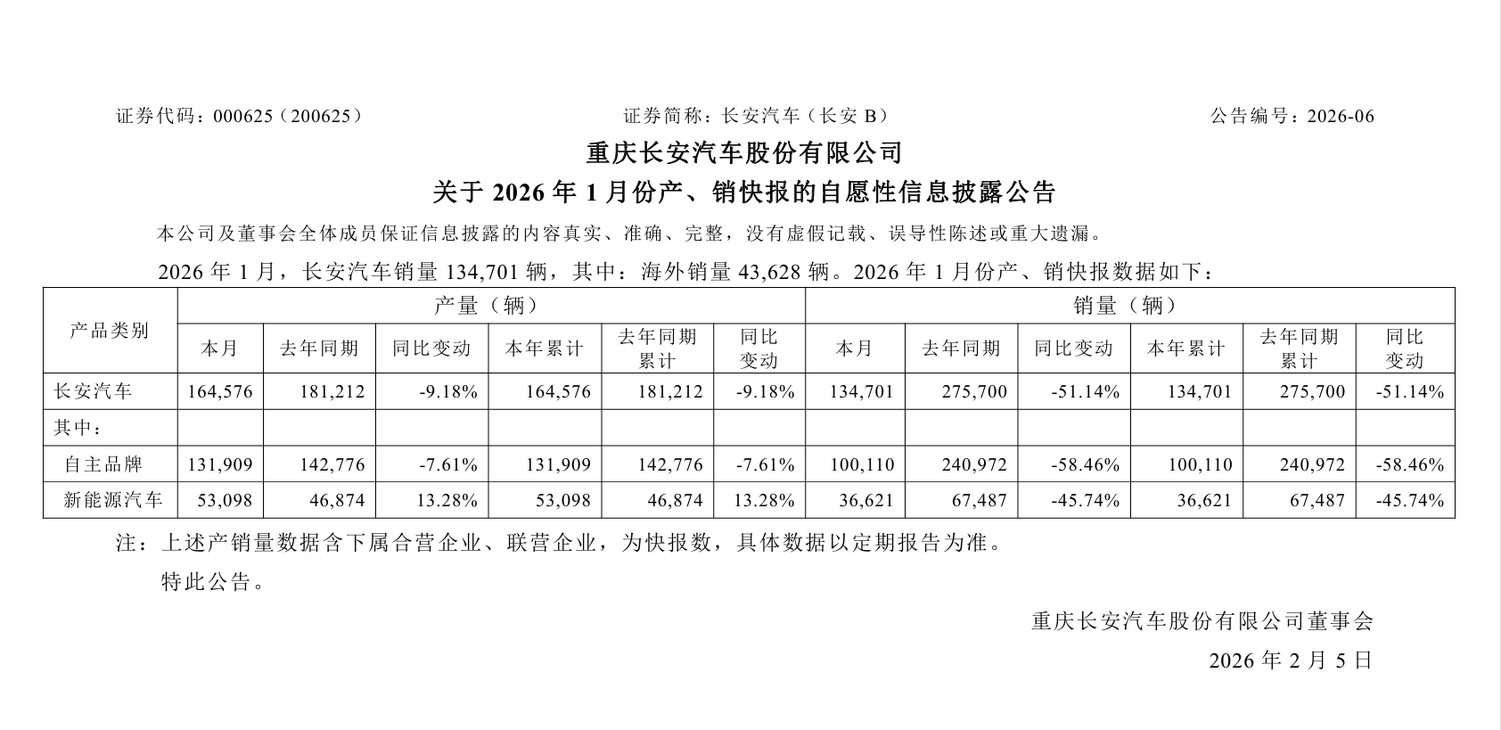 2月4日晚间,长安汽车发布2026年1月产销快报,公司当月销量表现承压,整体销量同比大幅下滑,同时新能源板块呈现产增销减的态势。此前披露的定增募资计划,彰显其布局新能源与智能化领域的战略决心。