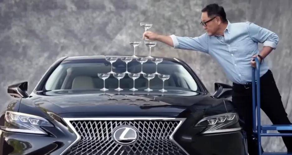 1989年,丰田工程师在初出茅庐的雷克萨斯LS400的引擎盖上,叠起一座由15只香槟酒杯叠成的杯塔,即便是车辆轰上油门,杯塔安然不倒,在静谧性这一维度重新诠释了豪华轿车的概念。不仅让雷克萨斯LS400名声大噪,也让丰田证明了自己耗费10亿美金的车型无愧于全球顶级的豪华轿车的定位。2020年“香槟塔”回归,主角从当时的工程师换成了时任社长的丰田章男,LS400也换成了全新LS,但依然可以感受到雷克萨斯的极致静谧。
