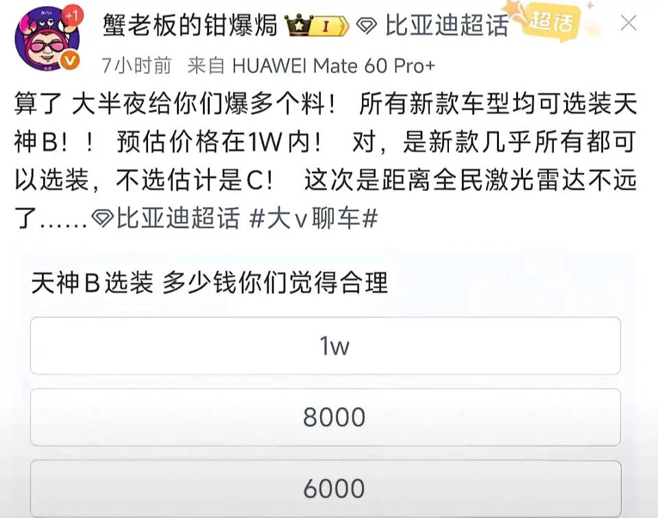 而另一个方向就是高段位智能驾驶辅助的不断下探,从今年的情况来看,很多十几万的车型都已经具备了城市NOA的能力。而据相关博主的爆料,比亚迪今年推出的新款车型,都将支持天神之眼B的选装,选装价格可能不到1万元,就连海鸥这样的小车,都支持选装,那么在这种情况下,我们可以说10万元的车型,都具备城市NOA能力了,这种冲击力就相当大了。如果说之前10万级的新能源汽车,优势只在配置水平和省钱这方面,那么之后在智能化方面,就完全不是一个层次了。