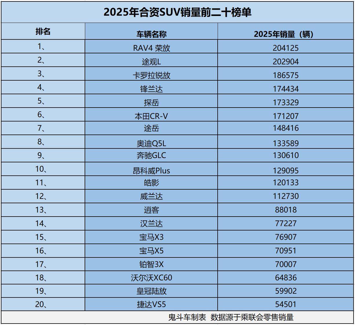 那么,哪些合资SUV车型卖得更好,不妨看看销量榜单,鬼哥根据乘联会零售销量数据整理出2025年合资SUV销量排名前二十榜单, 结果发现,合资SUV阵营中,销量表现并没有想象中那么差劲,相反,热销车型不在少数。接下来,看看具体排名与销量表现。