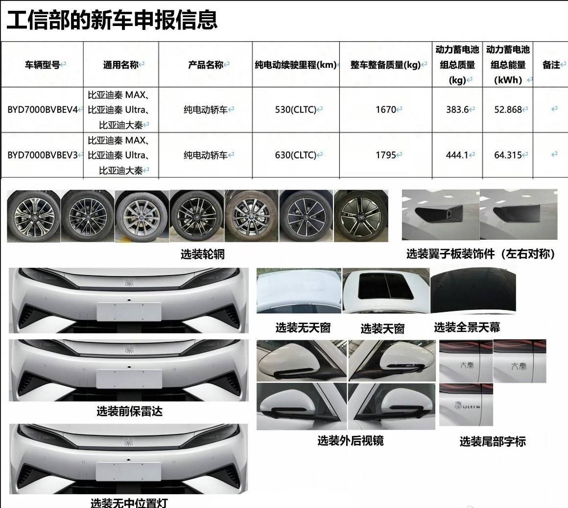 外形上,秦MAX和秦L的设计差不多,仅在保险杠、中网等细节部位微调,保险杠两侧的黑色格栅面积更大,风格更运动。车尾造字标可选“大秦”或“秦ultra”等。此外还提供轮圈、翼子板装饰件、天窗/天幕等多种选配。