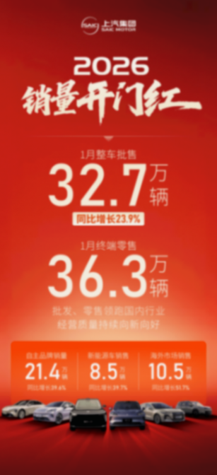 今年1月,上汽集团整体业绩表现亮眼:继2025年实现全年销量同比两位数增长后,2026年首月整车批售达32.7万辆,同比大涨23.9%;终端零售量更突破36.3万辆,成为行业内单月零售唯一跨越30万辆大关的企业,在批发与零售两端均展现出领先优势,经营质量持续向新向好。海外市场成为尤为突出的增长极。1月,上汽海外销量达10.5万辆,同比激增51.7%。其中,连续11年蝉联“自主品牌欧洲销冠”的MG品牌,继去年12月在英国跻身月度销量第二后,今年1月在欧洲交付近2.6万辆,同比增长约15%,品牌国际影响力稳步提升。