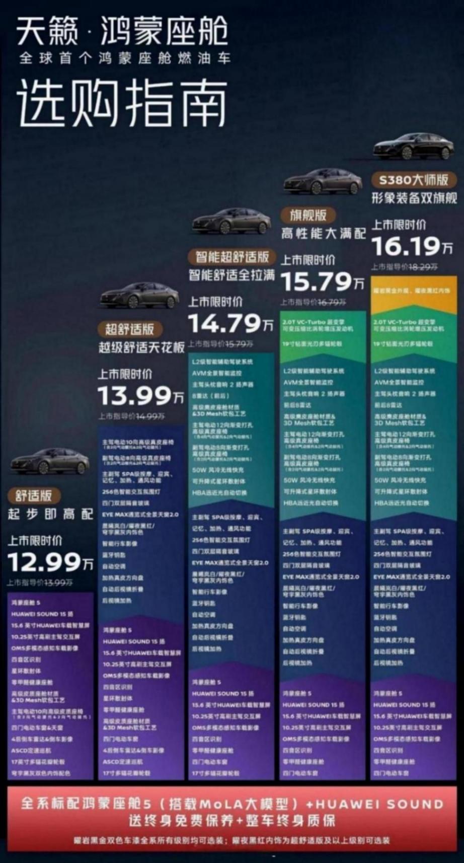 这次东风日产更新的天籁产品线主要是带来了新款的天籁·鸿蒙座舱S380大师版,也就是在之前的基础上又推出了一款顶配车型,定价是18.29万元、限时优惠是16.19万元。相比于之前的旗舰版贵了4000元,主要是增加了曜岩黑金外观和曜夜黑红内饰,前者是一个双拼色,看上去更有高级感。其余配置则和旗舰版相同,包括2.0L VC-Turbo发动机和鸿蒙座舱,而东风日产表示之所以加推高配版,主要是因为天籁·鸿蒙座舱新车的高配占比达到了70%,很多90后年轻用户对2.0T的动力需求更明显。