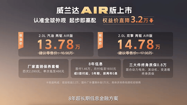 全新换代威兰达2.0L汽油AIR版权益价13.78万元,2.0L混动AIR版权益价14.78万元的亲民起价,搭配“入门配置拉满”的高规格产品力、全国统一价的“厂家直销保养套餐”以及长达8年超长期低息金融方案,积极回应了用户从购车、养车、用车全周期痛点的真实关切。