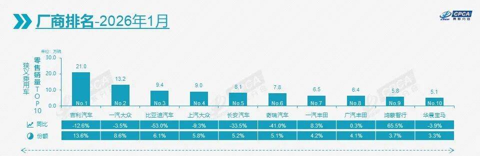 上汽大众回到了第四,1月零售9万辆,同样是燃油车守住了既有份额。