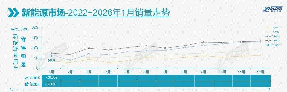 先看新能源渗透率:1月新能源乘用车零售为59.6万辆,同比下滑20.0%,零售渗透率达到了38.6%,较去年同期下降了3个百分点。