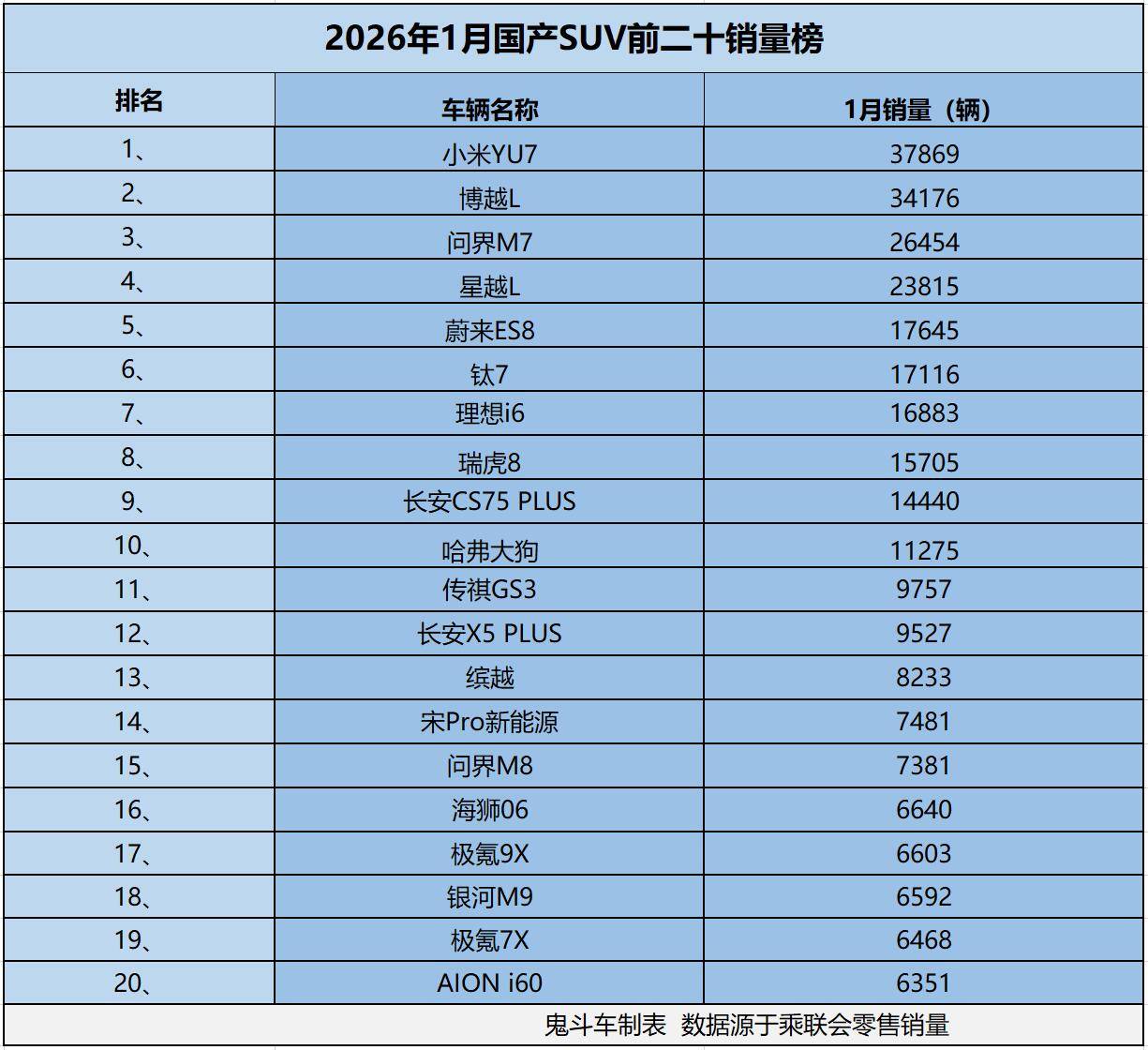 此外,进入销量排名前二十榜单的车型还有问界M8、海狮06、极氪9X、银河M9、极氪7X以及AION i60,这些国产SUV在1月份零售销量都超过6300辆。