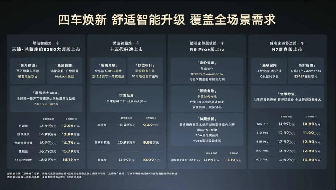 十五代轩逸、天籁 · 鸿蒙座舱 S380 大师版、 N6 180 Pro+ 、 N7 青春版四款新车同步上市,覆盖燃油、插混、纯电三大技术路径,精准卡位 10-20 万级家用核心市场。