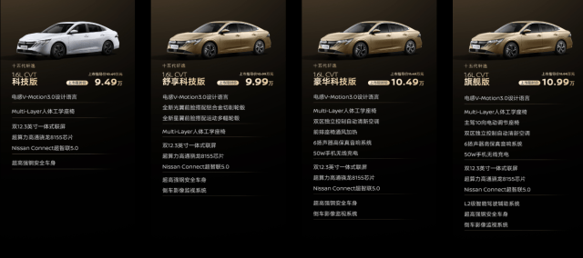 这次全新一代轩逸一共有4个配置,如果预算有限,那我直接建议买科技版或舒享科技版,限时价分别是9.49万元和9.99万元。科技版毕竟是入门车型,配置相对简单,座椅是织布的,方向盘是塑料的,后期需要自己装潢一下。舒享科技版贵了5000元,多出了倒车影像、皮质方向盘、皮质座椅、后排出风口、后排杯架,值不值得看自己需求了。