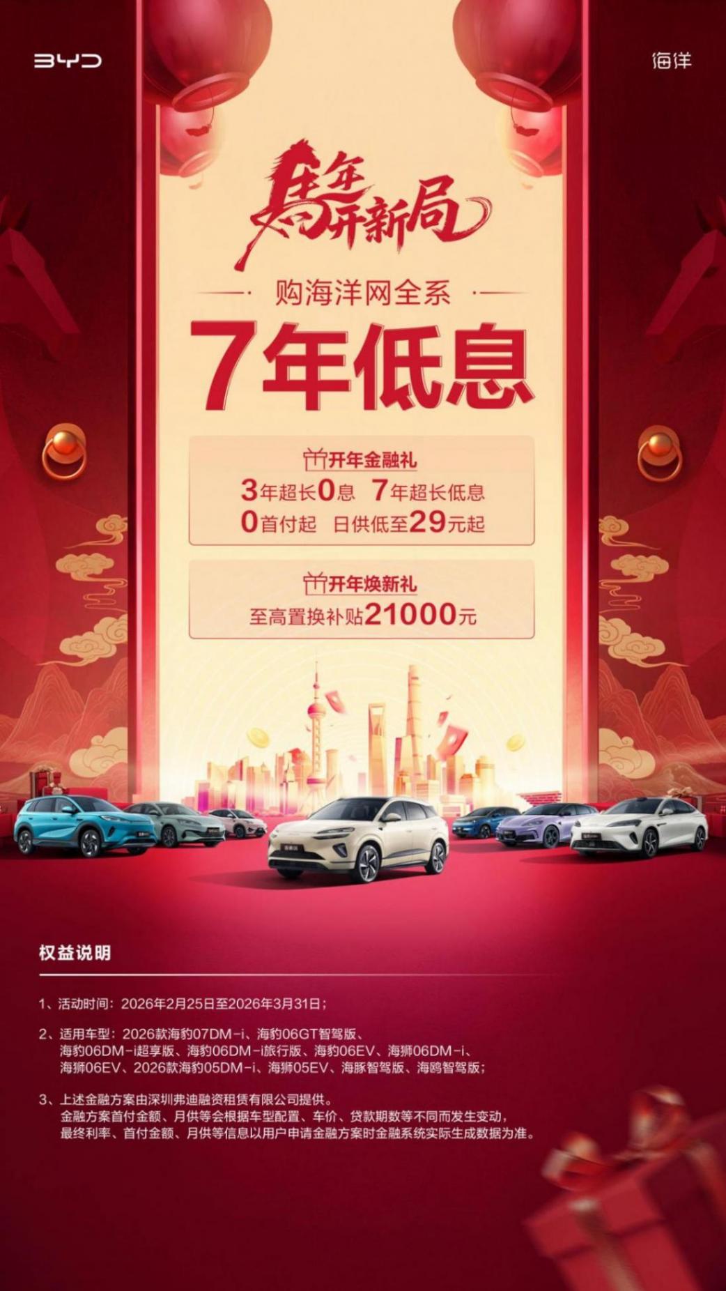 具体来看,即日起至3月31日,凡购买2026款海豹07DM-i、海豹06GT智驾版、海豹06DM-i超享版、海豹06DM-i旅行版、海豹06EV、海狮06DM-i、海狮06EV、2026款海豹05DM-i、海狮05EV、海豚智驾版以及海鸥智驾版,即可立享购车政策,不仅有“3年超长0息、7年超长低息”等“开年金融礼”,同时更有“至高置换补贴21000元”的“开年焕新礼”,一步到位诚意拉满,政策优惠明细实实在在,助力更多车友在新的一年马力全开,对比起友商“综合优惠 xx 万元”的文字游戏要实诚太多了。