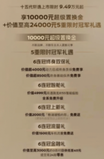 为了进一步强化用户体验,东风日产同步推出动力总成终身质保免费权益,并为十五代轩逸提供10000元超级置换金及价值至高2.4万元的5重限时冠军礼遇,包括6连冠终身双保礼、6连冠智舱礼、6连冠上新礼、6连冠流量礼及6连冠金融礼等多项支持,使产品价值与用车安心感实现同步提升。