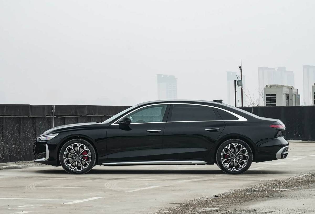 车身尺寸上,全新奥迪A6L的长宽高分别为5142mm、1887mm和1464mm,轴距达到3066mm。相比现款车型,车身长度增加了92mm,轴距加长42mm,高度略有降低,整体视觉效果更显修长。车侧采用了半隐藏式电子门把手,并保留了应急机械开启方式。此外,新车还提供多款大尺寸轮圈,其中包括黑化风格轮圈。