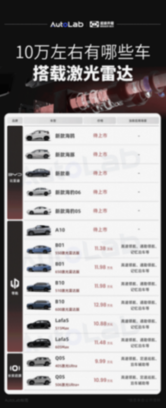 与此同时,包括小车在内,我们也整理了价格在10万左右并搭载激光雷达的车型,希望能给大家在看车、购车时提供参考。