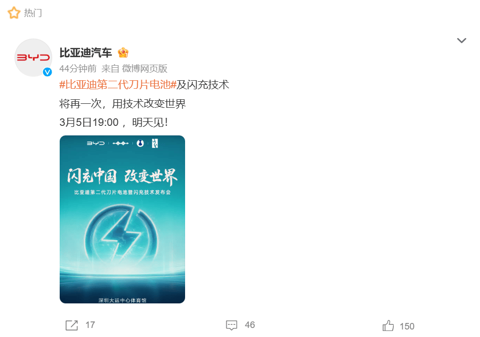 3月4日,比亚迪汽车在微博发布消息,第二代刀片电池暨闪充技术发布会定于3月5日19:00,在深圳大运中心体育馆举办。本次发布会将集中展示比亚迪在动力电池与高效补能领域的最新技术成果,行业关注度较高。