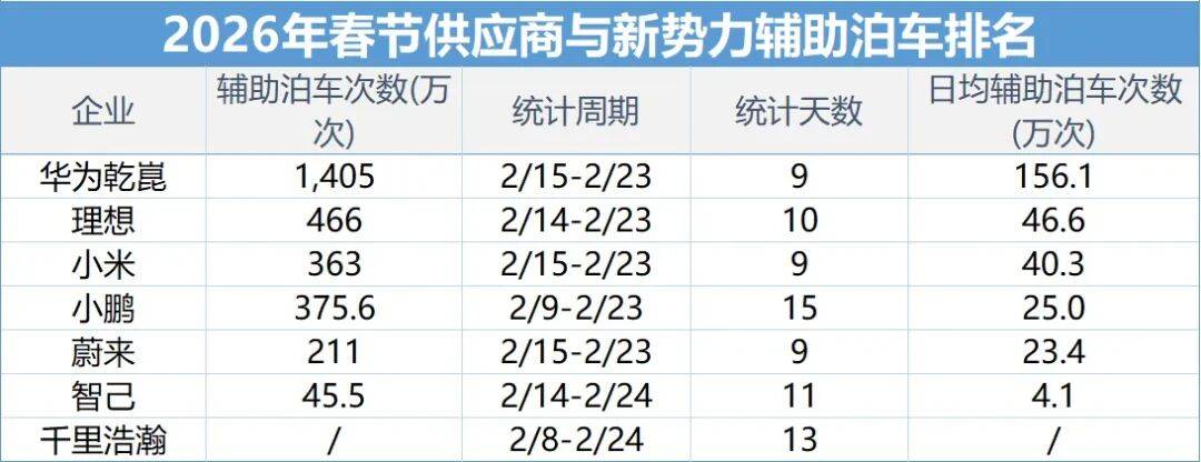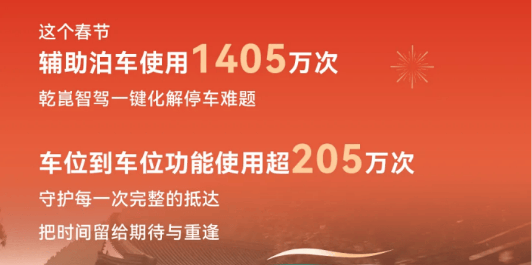 图丨2026年春节,华为乾崑辅助泊车使用1,405万次,车位到车位超205万次