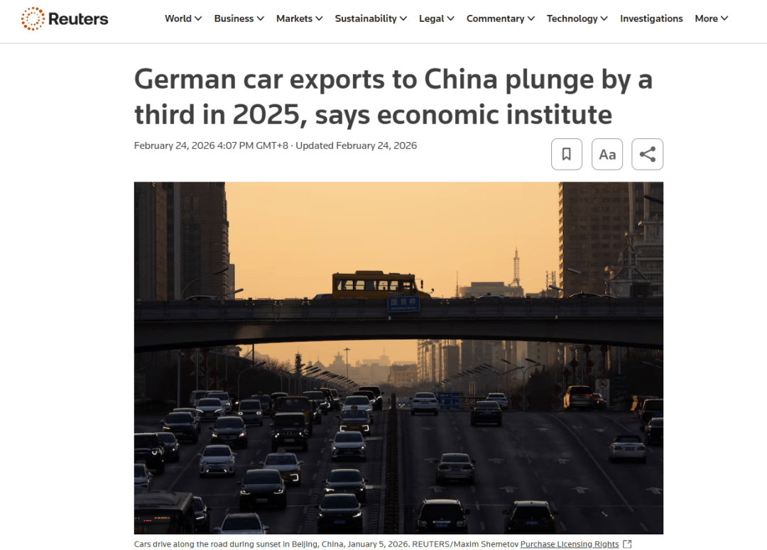 德国经济研究所(IW)的研究显示,德国对华汽车出口在2025年暴跌三分之一。