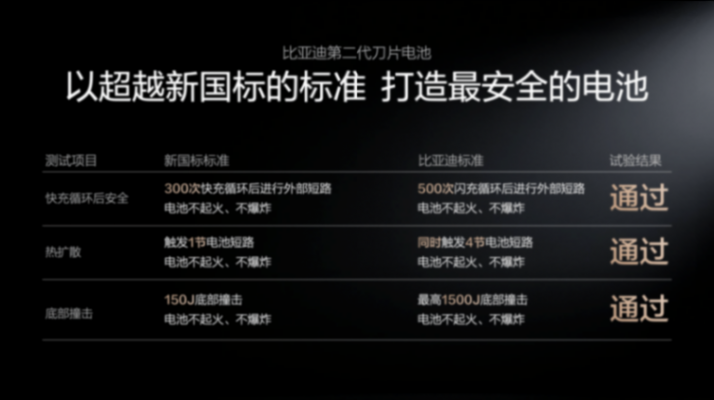 第二代刀片电池继续将安全进行到底,通过一系列超越新国标的安全测试,为用户打造最安全的电池,确保电池全生命周期都安全,彻底打消用户的安全顾虑。