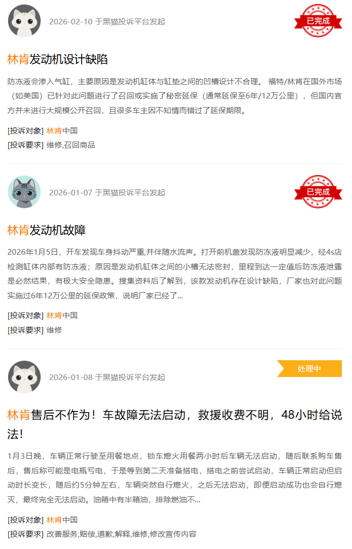 另一方面,林肯在豪华品牌中的口碑确实比较一般。投诉问题覆盖老款与新款车型,老款车型中,2017款、2018款MKZ及MKC车型的“发动机漏防冻液”问题成为重灾区,大量车主反馈,车辆会出现发动机剧烈抖动、防冻液频繁报警等问题,这一问题被证实是发动机设计缺陷,但林肯在北美早已启动召回程序,却对中国消费者采取“双标”态度,仅通过未公开的“内部延保”敷衍应对,导致大量车主自掏腰包为厂商的缺陷买单。