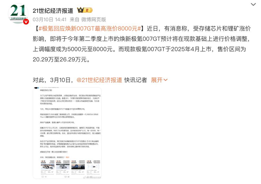 近日,网络消息称,受存储芯片和锂矿涨价影响,新一代极氪007GT预计涨价,上涨的幅度或为5000元至8000元。对于网传的消息,极氪汽车方面回应媒体表示,“价格方面,公司会综合多方面因素,暂时还未确定。”并强调在官方发布之前,这些网传信息都是不准确的。
