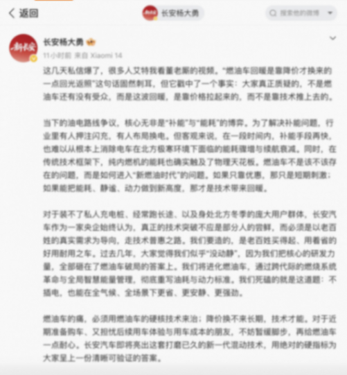 听来格外振聋发聩!但正如杨大勇在微博里所说:“燃油车的痛,必须用燃油车的硬核技术来治;降价换不来长期,技术才能。”