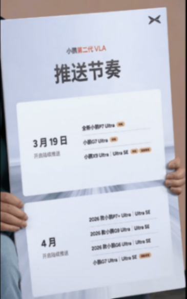 小鹏VLA 2.0在3月19日将开启陆续推送,首批先推送全新P7 Ultra,再推送G7和X9。4月推送P7+、G9,G6等。同时,VLA 2.0量产推送的版本是第四个大版本的第28个小版本,与之前的媒体试驾版不同(第二个大版本),但不会因为量产,把某些功能阉割掉。