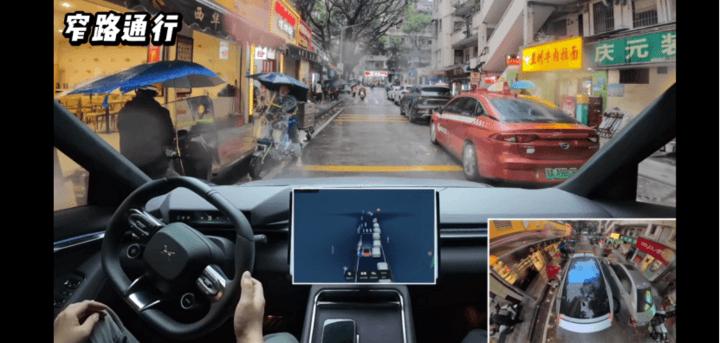 针对窄路通行的复杂场景,通过重构底层架构,解决了双车道右侧停满临停车、左侧电动车和行人频繁出现的难题,实现了既安全又流畅的通行。