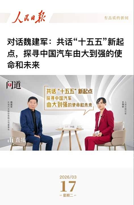 在2026年全国两会胜利闭幕、中国“十五五”规划即将开启的关键节点,《人民日报》专访长城汽车董事长魏建军,显然带来对中国汽车产业的深度思考。