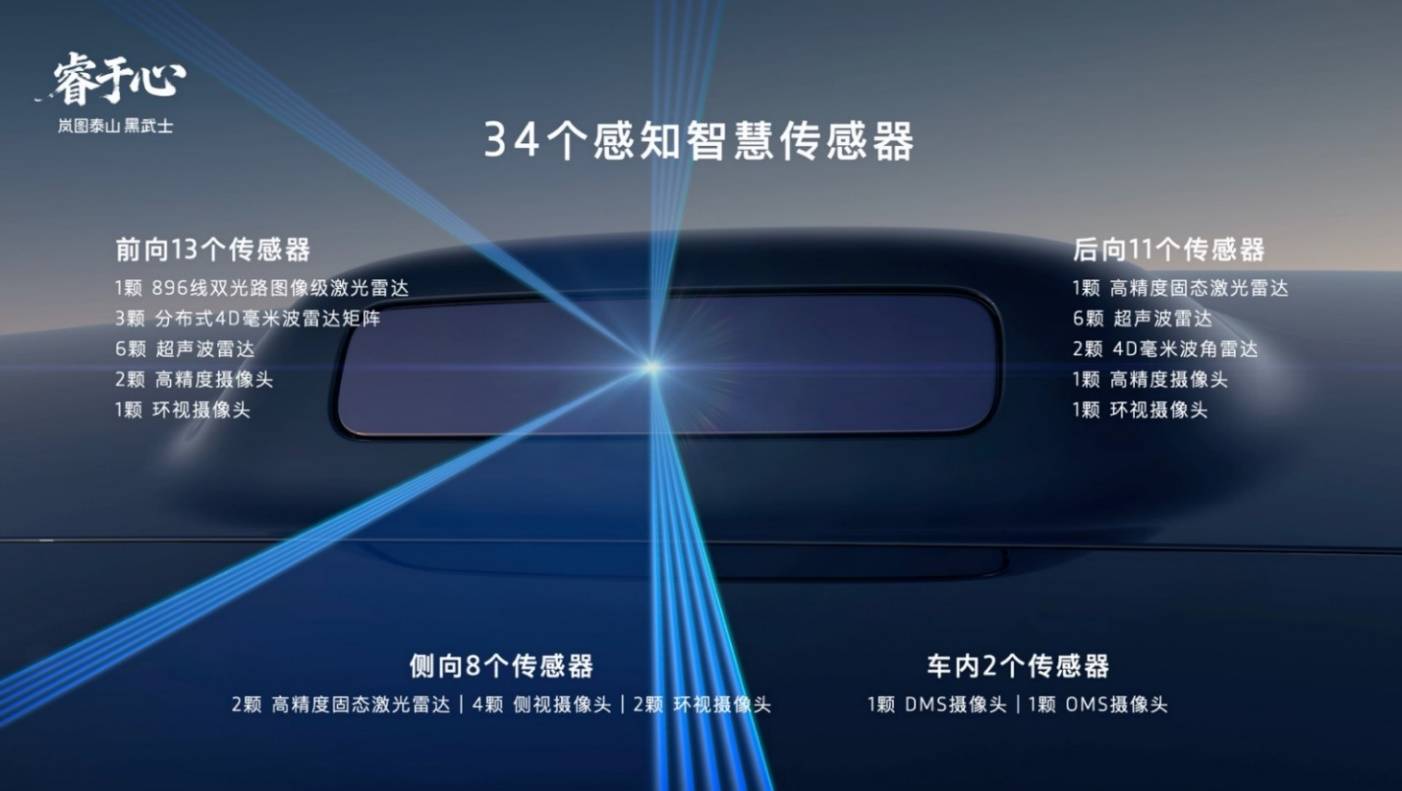 在与华为乾崑的深度优势互补下,岚图泰山Ultra及黑武士搭载了华为目前最新的乾崑ADS V4.1激光雷达方案,配备了包括激光雷达,高清摄像头、毫米波雷达、超声波雷达在内共计34颗高精度传感器,构建起全场景无死角的感知网络,为高阶智能辅助驾驶决策提供可靠依据。尤其核心的全球量产最高规格896线双光路图像级激光雷达,相比传统192线激光雷达,896线激光雷达实现了断层领先,针对30cm高度障碍物最远识别距离高达162米,针对14cm小目标也能实现120米远距识别,真正实现了从“点云级”到“图像级”的跨越,是目前行业感知硬件的“天花板”。