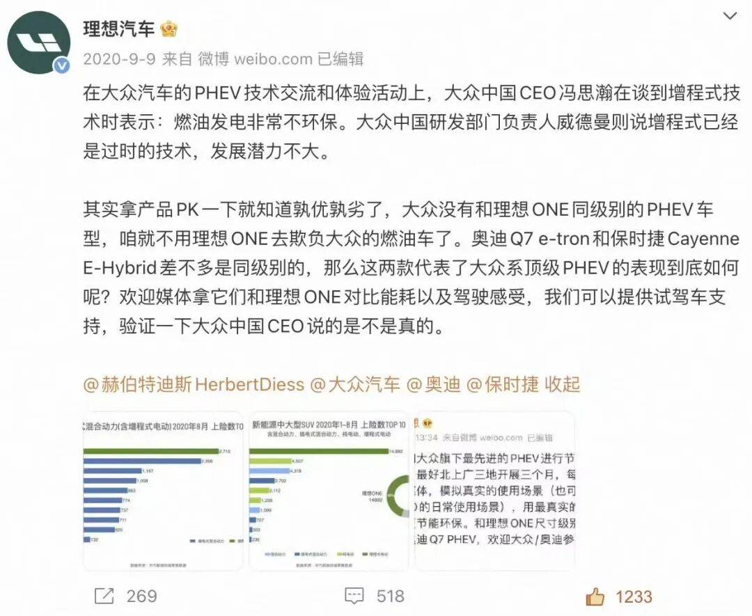 而在孙敏杰晒出的第二张微博配图里, 理想汽车在2020年发布微博时称大众高管曾表示增程是过时的技术。