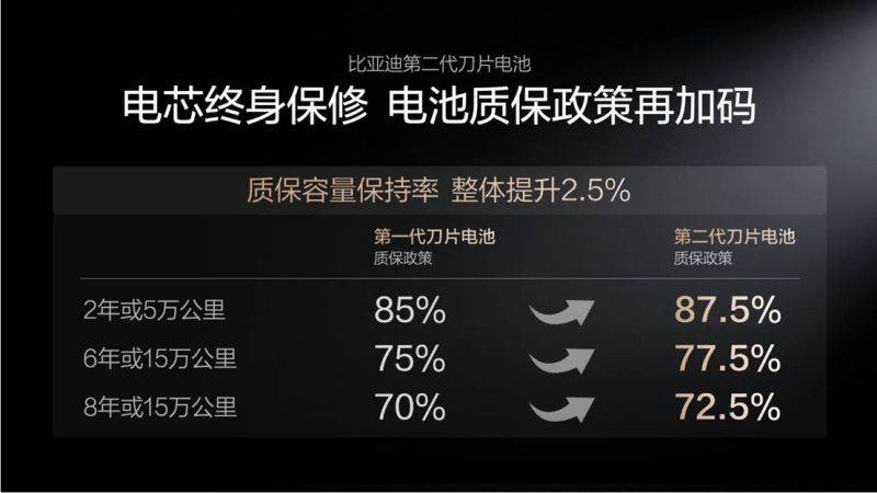 这还不够,严苛测试之外,比亚迪更拿出极具诚意的“质保政策”,第二代刀片电池在6年或15万公里质保期内,电池容量低于77.5%,即可享受免费包换服务,较第一代刀片电池,容量衰减门槛提升2.5%,同时,对电池的“心脏”——电芯提供“终身保修”权益,彻底打消用户“后期换电池成本高”的顾虑。而这一系列的操作再次彰显比亚迪对于自身技术的自信以及对用户负责到底的大厂担当。