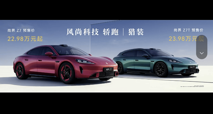 尚界旗下全新中大型轿车尚界Z7和尚界Z7T同步亮相并开启预订,尚界Z7预售价22.98万起,尚界Z7T预售价23.98万起。