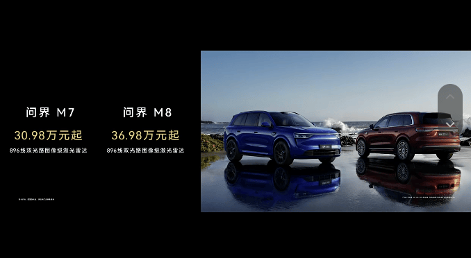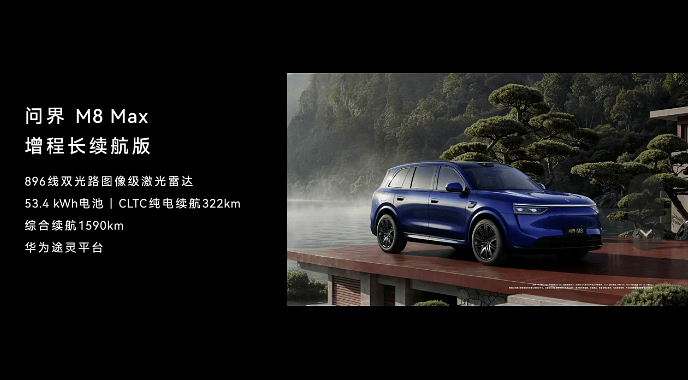 M8则增加瑞红、湛蓝两种车身颜色,并且搭载896线双光路图像级激光雷达。同时推出问界M8 Max增程长续航版,CLTC纯电续航里程322km。