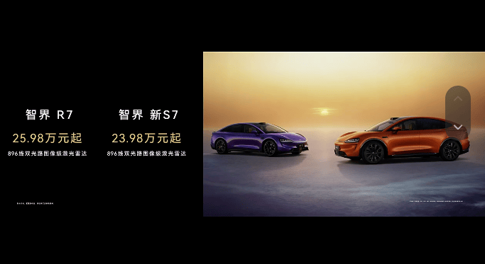 智界R7与智界新S7新增暗夜紫与活力橙两款车色,搭载896线双光路图像级激光雷达,另外鸿蒙ALPS健康座舱搭载MOFs抗菌滤芯与吸附降解材料,座舱与智驾能力同步升级。