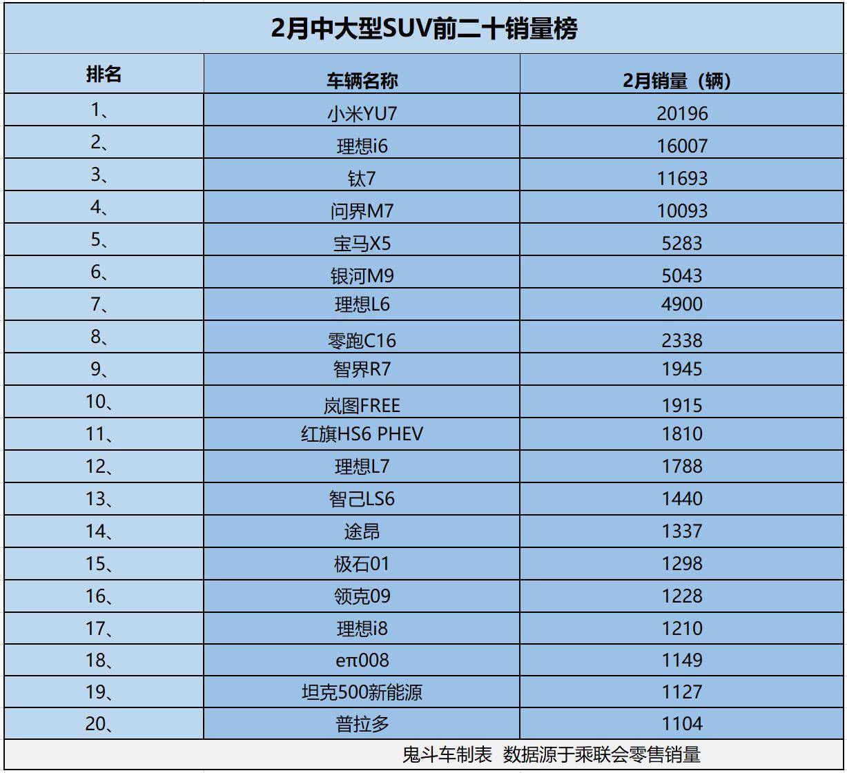 宝马X5排名第五位,2月零售销量达到5283辆,现在,很多新势力公开叫板德系豪华,可它们依然有着自己的粉丝群体。银河M9排名第六位,2月零售销量达到5043辆,这款车型的销量表现也不错,跟对手相比,这款国产中大型SUV的性价比优势更明显。