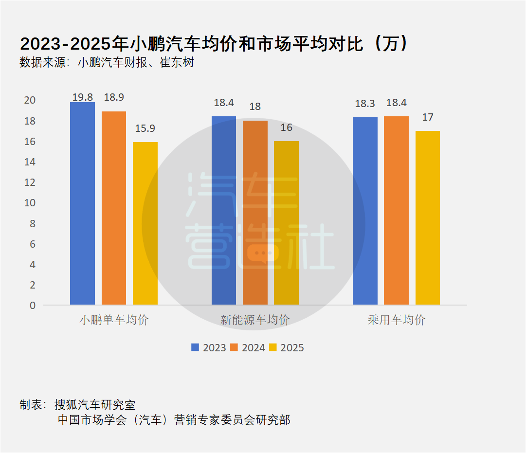 为小鹏销量贡献了近60%的这两款车型的售价基本稳定在20万元以内,而作为主要产品的MONA M03还是售价10-15万元的经济型紧凑型轿车。横向比较看,2023年到2025年,小鹏汽车单车均价持续下降,从2023年的平均19.8万一辆车快速下降到2025年到15.9万,绝对价格从高于市场平均到低于市场平均,降幅也较市场整体降幅更大。也就是说,随着销量快速放大,小鹏的单车收入中枢其实在往下走。