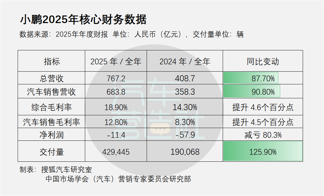 2026年3月20日,小鹏发布的2025年第四季度及全年业绩公告显示,全年交付42.94万辆,同比增长125.9%;全年总收入767.2亿元,同比增长87.7%;全年毛利率18.9%,较上年提升4.6个百分点;到四季度,单季交付达到11.62万辆,营收222.5亿元,毛利率升至21.3%,并实现净利润3.8亿元,这也是小鹏汽车成立至今首次实现季度盈利。