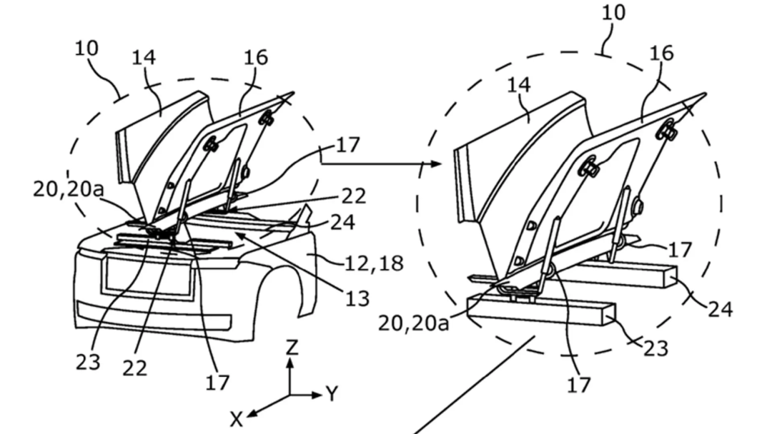 劳斯莱斯在2024年就为此设计提交了专利申请,从中也能大致看出其结构。我们还能在引擎盖前端看到疑似铰链的结构,不过放大细看,它看起来更像是一个带十字批头的钻头配件。