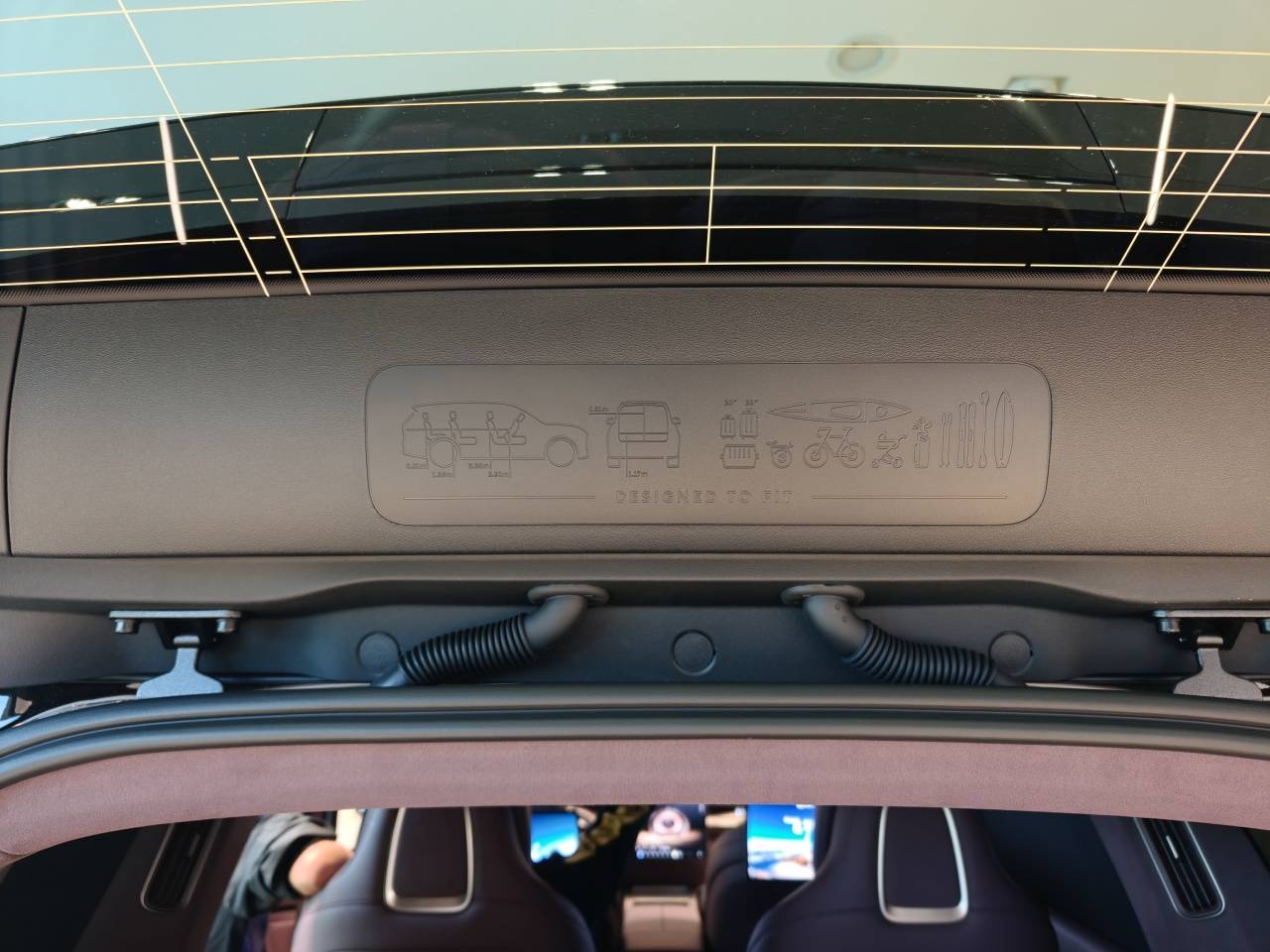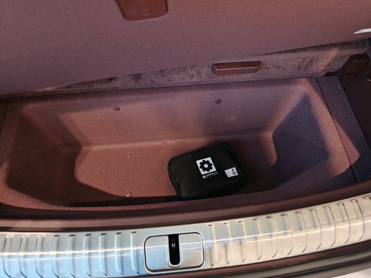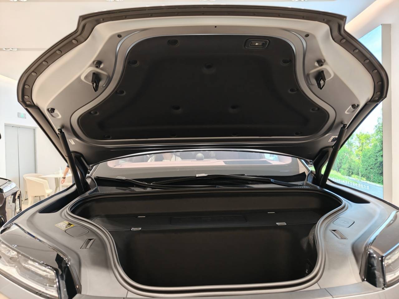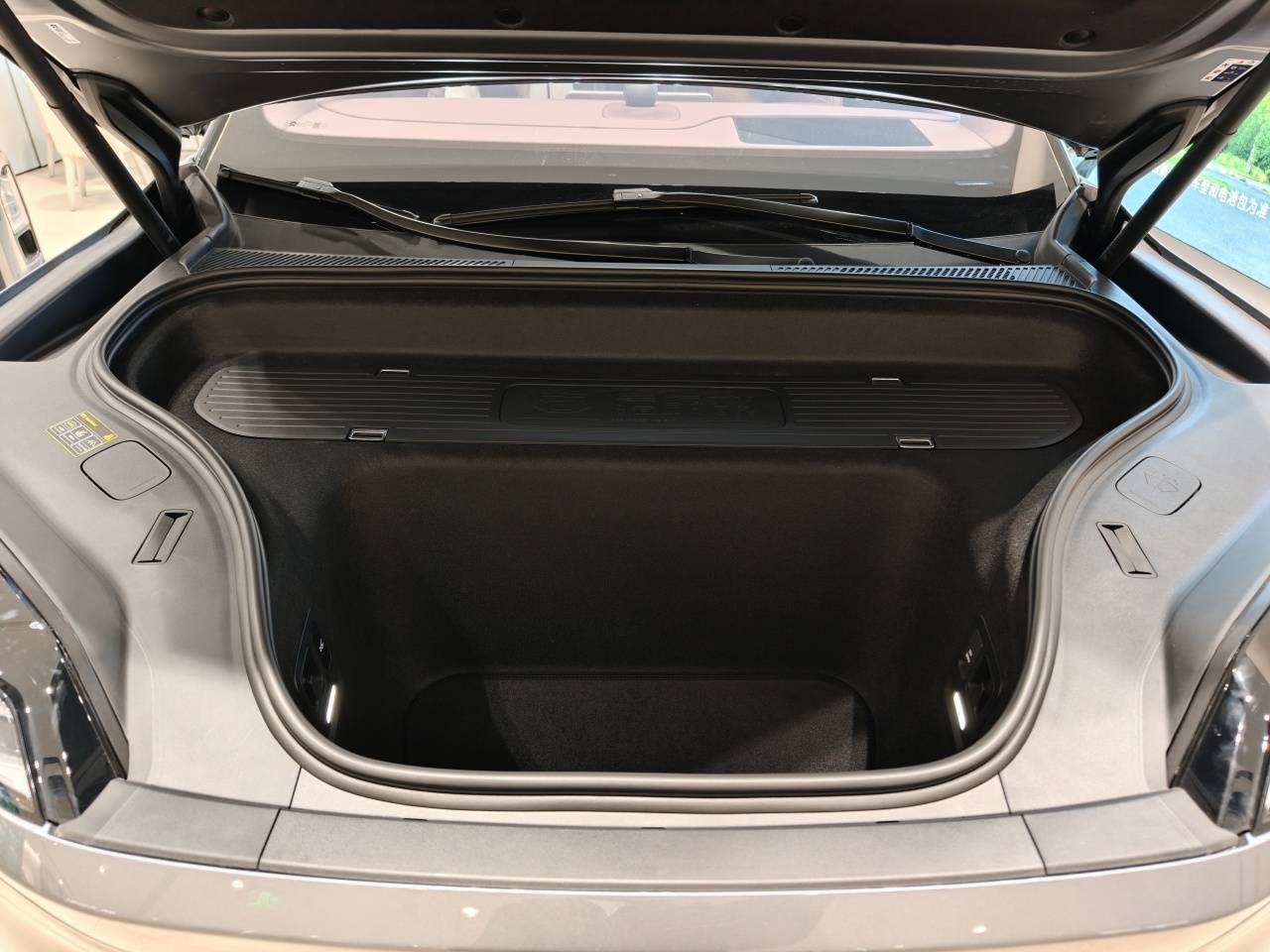 电动前备厢内还配备了置物板,搭配四个锁扣,可以固定高尔夫球包一类的物品,中间还印有物品摆放示意图,这个设计借鉴了沃尔沃。此外,前备厢内衬做工精致,还搭载了照明灯带,前舱盖内侧也铺设了隔音材质,电动开关则集成在车内,设计上还是相当讲究。不过这次蔚来ES9的前备厢只有12V电源接口,而没有做别家的220V接口,可能是出于安全考虑。