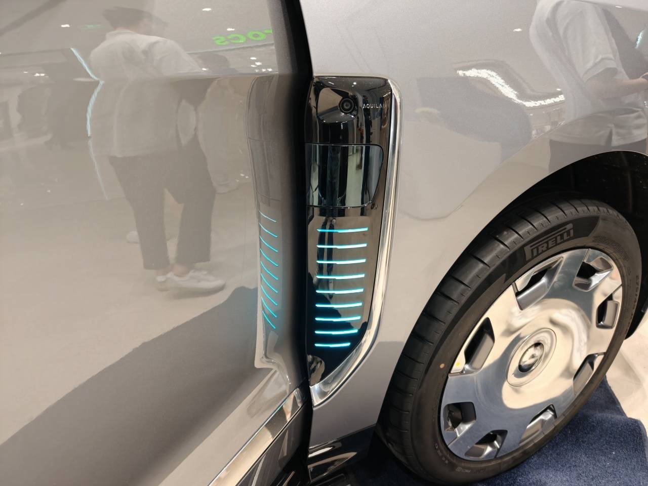 车身侧面,实拍车型搭载了22英寸大饼轮毂,前翼子板采用垂向徽标旗标设计,集成了侧面激光雷达、摄像头以及可交互灯组,科技感拉满。同时,车身侧面的银色饰条相比ES8增加了垂向设计,看上去更豪华,而且这次蔚来“听劝”地新增了电动脚踏,更方便上下车。