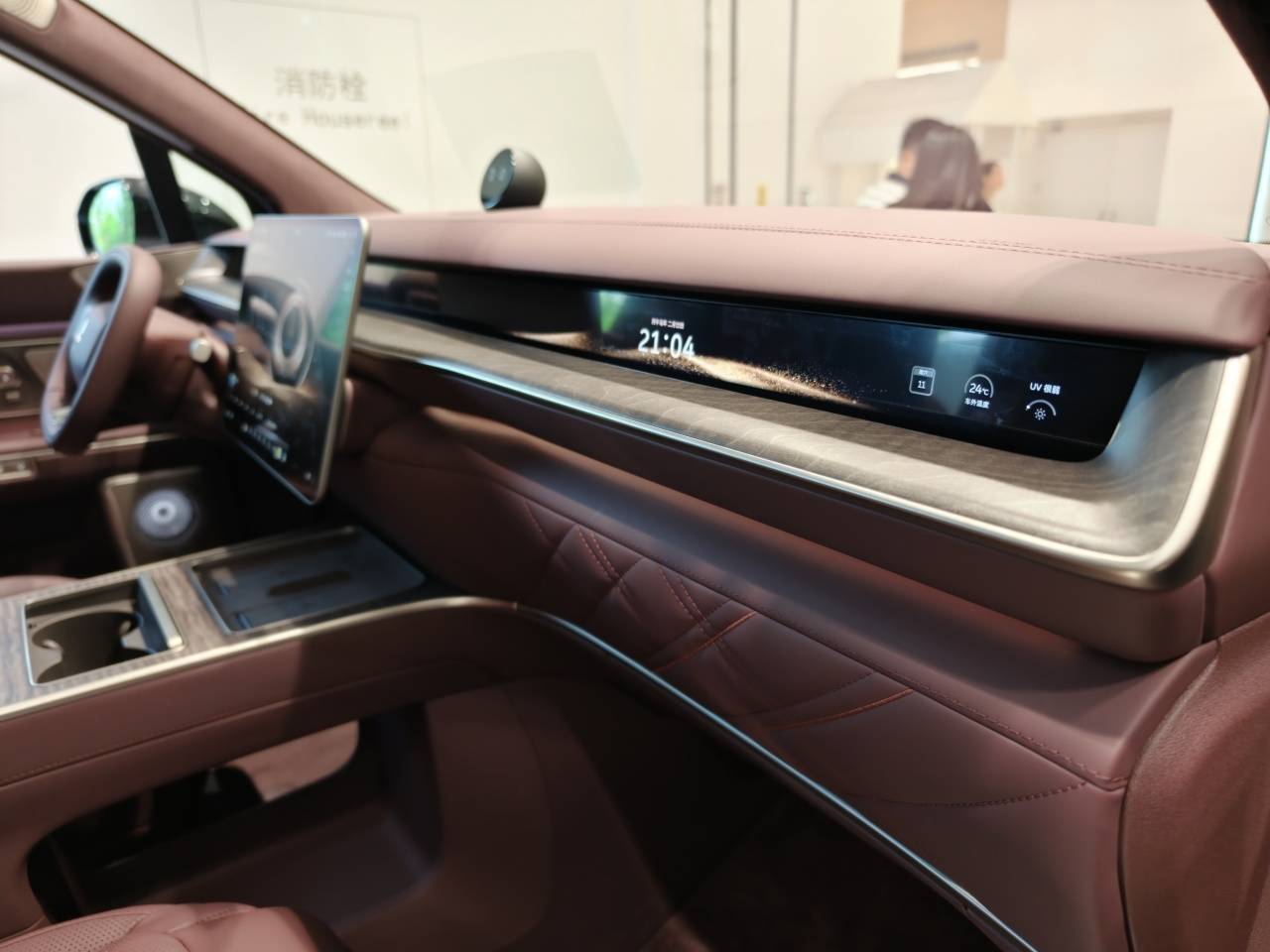 中控台延续了ET9、ES8的贯穿式条形屏幕设计,中间为15.6英寸AMOLED中控屏,而且非常精细地采用了大R角的圆形倒角处理,很有苹果的风格。前IP台全部采用软质皮革材料包覆,搭配精致双缝线工艺,下方还配备了氛围灯,氛围感十足。中央操纵台同样运用木纹饰板与触控按键,整体布局与ES8保持一致。