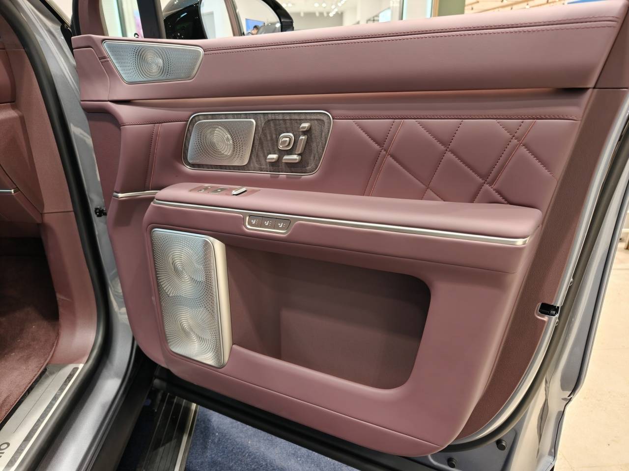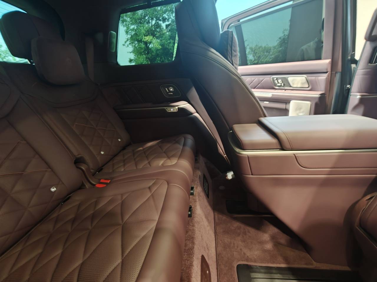 首先是车门部分,现在旗舰豪华SUV都在车门上集成了大量实体按键,包括座椅调节、车窗控制、座椅通风/加热/按摩,还有三组扬声器面板。车门采用大面积皮革包覆和精致双缝线工艺,搭配恰到好处的木纹饰板与金属音响罩,层次丰富,豪华感感尽显。