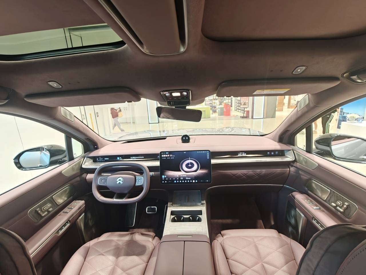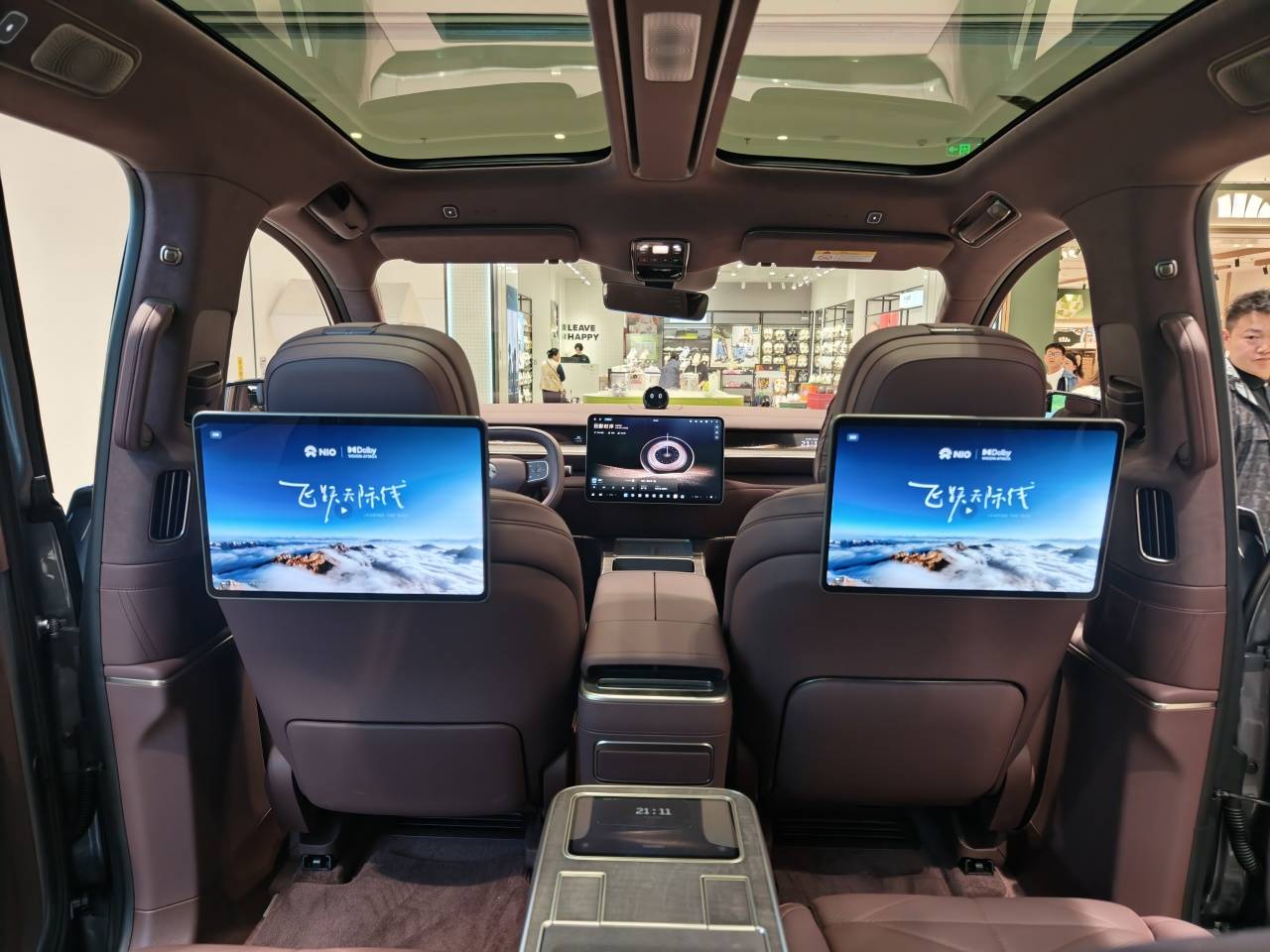 车内最核心的亮点当属第二排。实拍车型为无中央通道的“中岛版”。据销售介绍,目前蔚来会优先交付中岛版本,而且带中央通道的版本价格和中岛版价格一样,但中岛版的功能、体验都要强很多,还有就是由于全新ES9在定位上要兼具商务接待需求,相当于可以变成四座车型。
