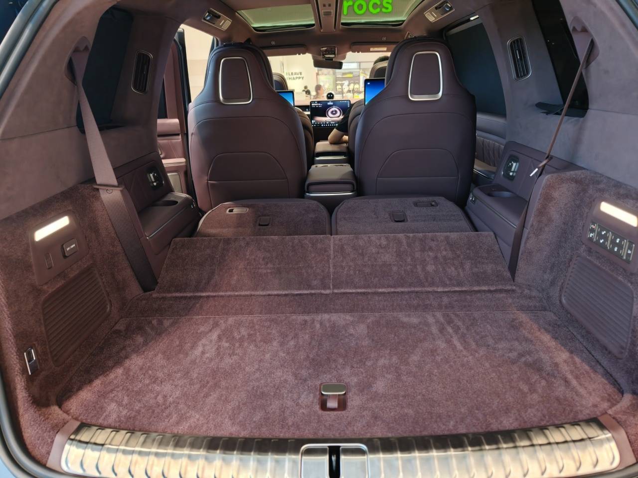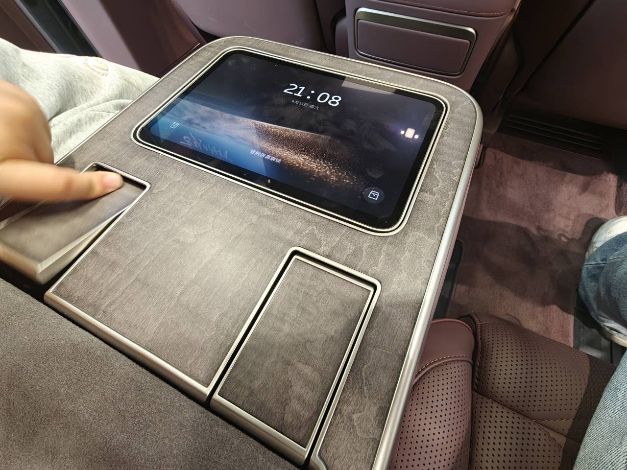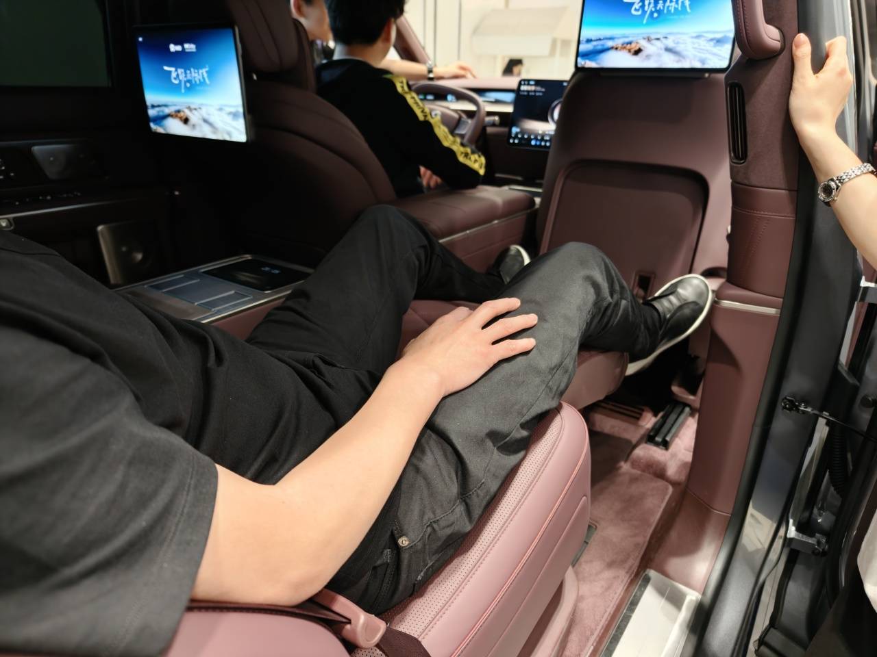 第二排座椅功能上该有的都有,新增配置除了足底按摩之外,前排还标配了第二排双屏幕。销售表示这一配置无法取消——可能小朋友们会很高兴,不用昂着头看屏幕,而且每个人都有一个。