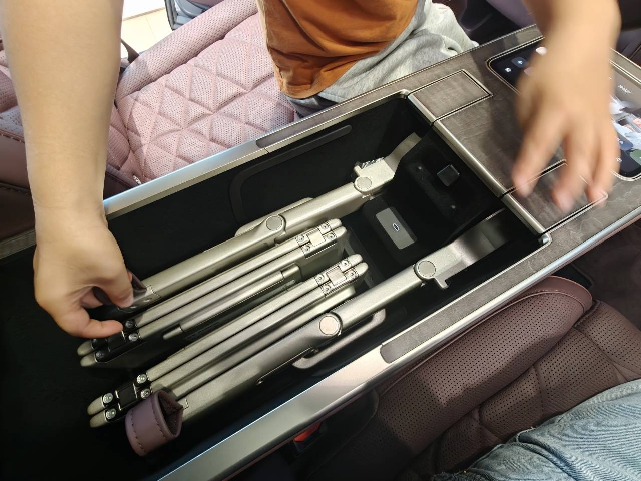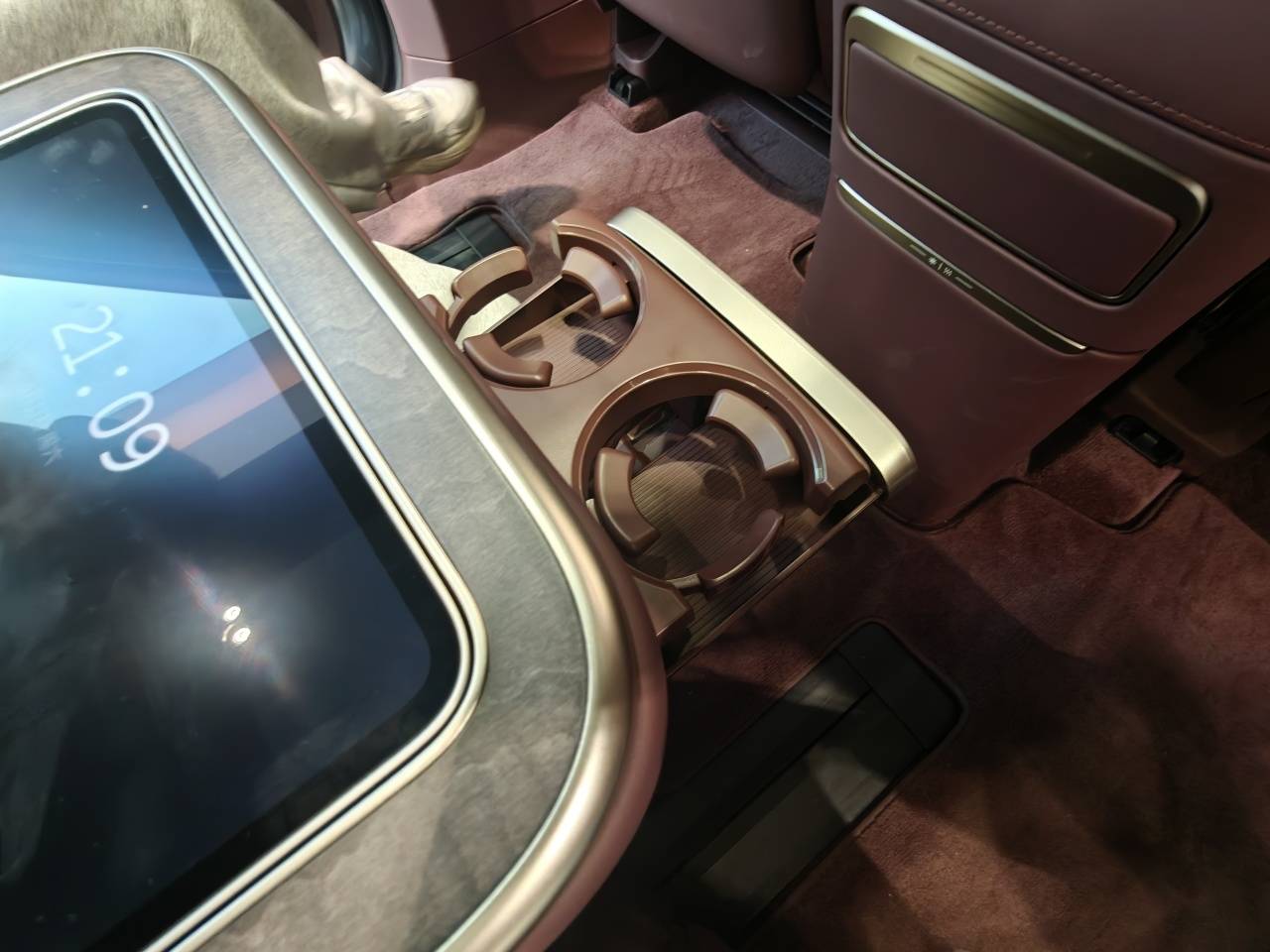 座椅中间的中岛功能和配置相当丰富,前端是小型触控平板,中间扶手还是可滑动设计,有无线快充;打开扶手,还配备两个可独立展开的小桌板。中岛前端下方也预留了杯架,甚至还可以增加茶台,而前排中央扶手后面则有220V取电口。由于中岛版售价与普通6座版完全一致,中岛相当于免费赠送的配置,这也是不少消费者直接选择中岛版的原因。