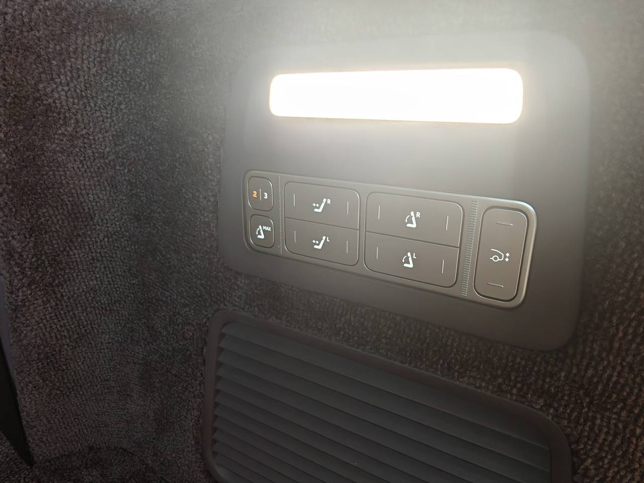 后备箱控制按键相对比较复杂,还专门设计了一个独立切换控制第二、三排座椅的按键。此外还设置了“一键最大化储物空间”按键,按下后第三排座椅放倒、第二排座椅前移,可以获得超大储物区域。另外值得一提的是,后备箱内部盖板全部采用植绒材质,质感极佳。需要注意的是,后备箱和前备箱一样没有220V电源接口,而是一个12V 180W的插口。