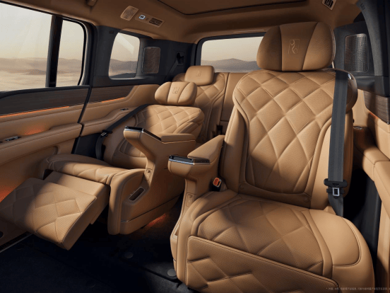 座舱方面,它整个内饰优化了设计和用料,有着5.3立方米的大空间,还采用了2+2+2的六座布局,二排膝部空间可达280mm,这让它的使用场景相较于之前可以说发生了质变,之前仰望U8还是个适合野外探寻的硬派越野,而仰望U8L鼎世版摇身一变,变成了一辆适合商务接待和家庭出行的车,这与其他加长车型有明显区别。