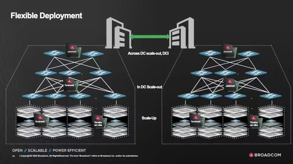 Velaga 表示“在尝试构建一个拥有 20 万个或甚至 10 万个 GPU 的集群时,功耗很快就会达到 300 兆瓦,而如今没有一个建筑能够提供 300 兆瓦的电力,Jericho 系列网络芯片将有助于解决这个问题”。