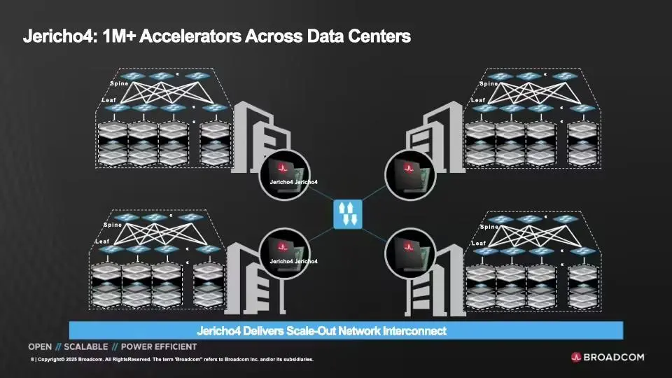 今天(8 月 5 日)发布博文,报道称博通(Broadcom Inc.)针对旧有较小规模数据中心,推出了 Jericho4 网络芯片,目的是连接相距超过 60 英里(96.5 公里)的数据中心,并加速人工智能计算。