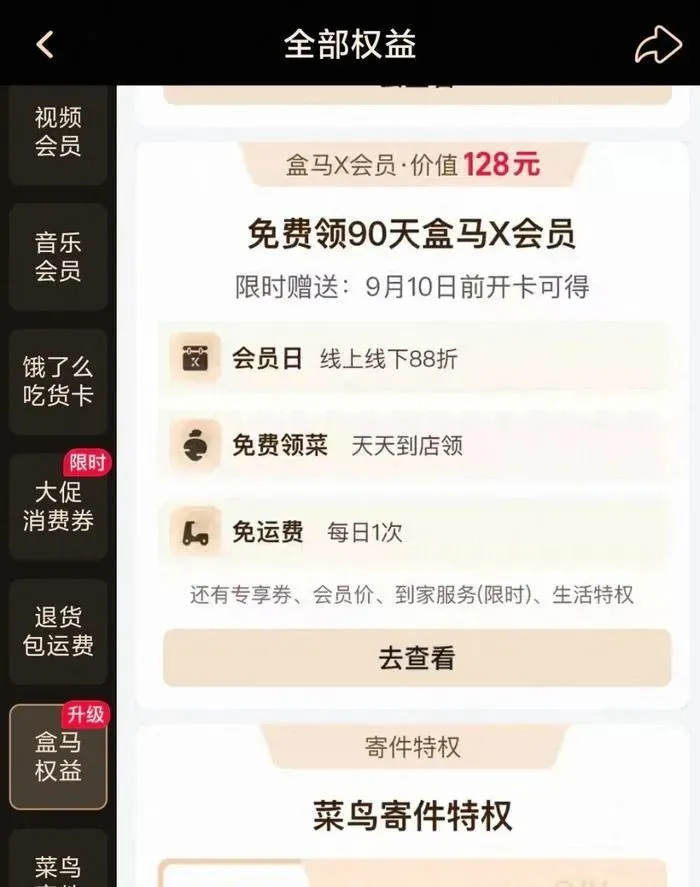就在8月4日,淘宝88VIP官宣新增一项会员权益,淘宝88VIP用户可领取一张有效期为90天的盒马X会员体验卡。这也是淘宝88VIP首次与盒马会员体系打通。